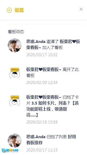 看板内所有成员的关键操作,像看板信息的变动、成员的加入或离开、列表与卡片相关操作等,以及这些操作对应的时间,都会被记录在看板设置界面的动态板块里。