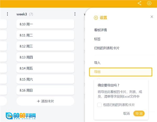 导出内容包含:卡片名称、卡片所属列表、卡片描述、卡片成员、卡片到期日、卡片完成状态、卡片完成时间、标签名称、卡片清单、卡片创建时间等信息。