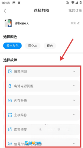 2、进入故障选择界面后,在故障类型选项中勾选对应的问题,这样能让维修师傅更精准地了解设备情况。