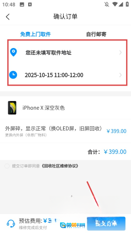 4、跳转至确认订单页面,填写取件地址与时间,勾选同意协议后点击【提交订单】,即可开启您的维修服务流程。