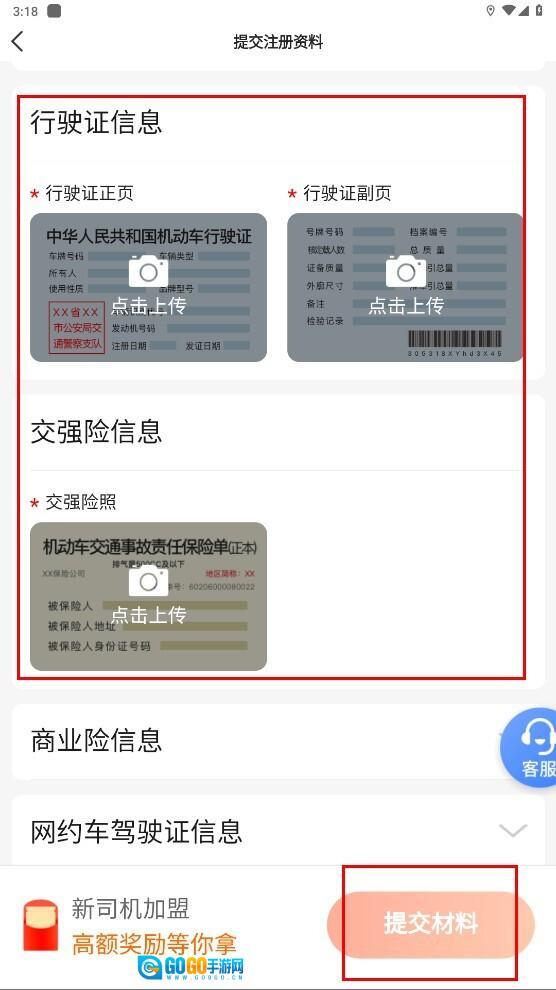 4、上传【行驶证正页】、【交强险照】等相关材料,仔细核对确认信息无误后提交,即可完成雷利出行司机端的资料提交流程。