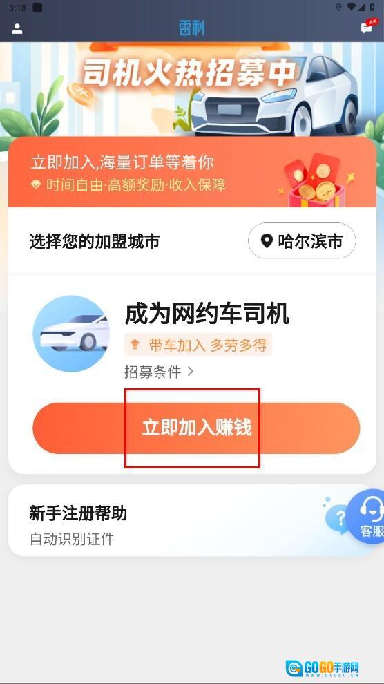 1、选择【哈尔滨市】这类城市后点击【立即加入赚钱】按钮,就能进入雷利出行司机端的注册环节,迈出成为网约车司机的第一步。