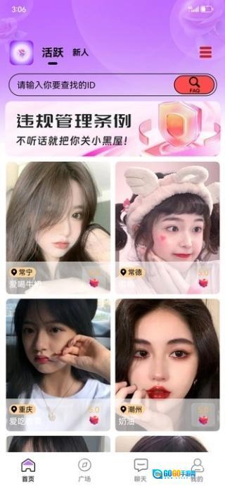 1、设有广场板块,能依据活跃、新人等标签浏览用户,便于迅速找到感兴趣的对象。
