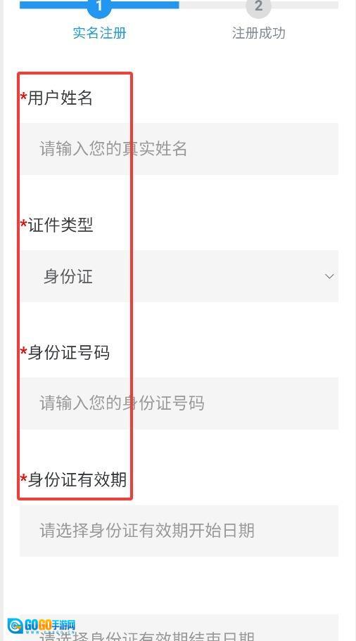 3、在实名注册页面填写用户姓名、证件类型、身份证号以及证件有效期。