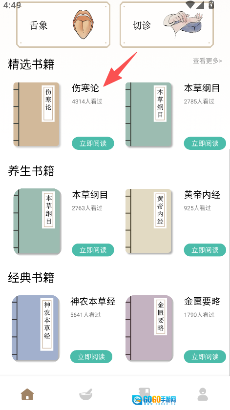 1、启动软件后,找到并点击精选书籍中的《伤寒论》,随后进入该书的阅读界面。