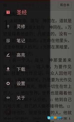 用户点击首页左上角,就能看到圣经、灵修、做笔记以及设置等选项。
