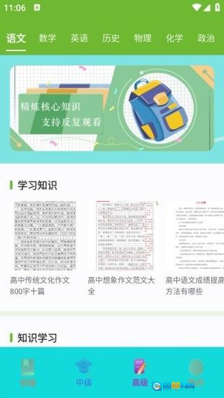 4、高级学习界面中,语文、数学、英语、历史、物理、化学等课程均有详细分类,学习者点击即可进入对应课程学习。