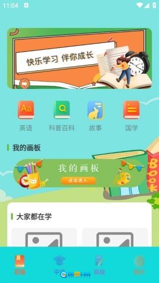 1、安装软件并打开后,进入初级学习界面,这里提供英语、科普百科、故事、国学等学习内容,同时也能进入“我的画板”进行绘画创作。
