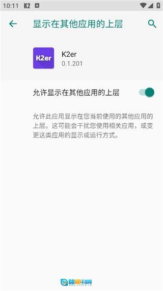 开启悬浮窗小部件功能,授权k2er获得在其他应用上层显示的权限。