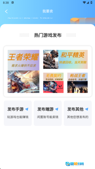 4、在“我要卖”页面选择热门游戏,之后开展发布、发布端流或发布其他相关内容的操作。