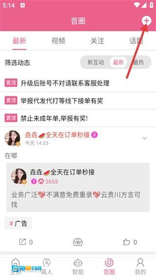 在音圈页面,点击右上角的【+】按钮,就能弹出功能选择菜单。