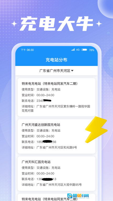 1、充电站搜索:充电大牛借助精准的地图定位功能,能让用户快速查找周边的充电桩,同时还会展示具体的位置详情以及设备运行状况。