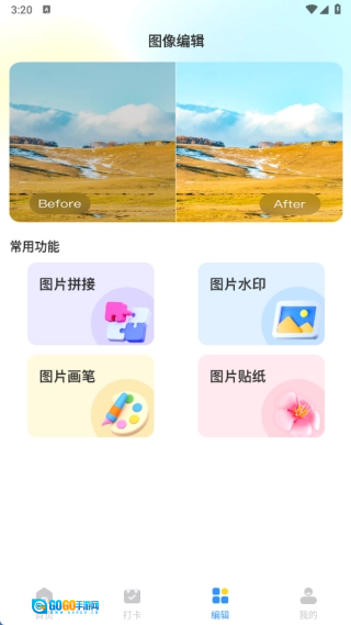 在编辑界面里,我们为用户提供了图片拼接、图片水印添加、图片画笔绘制以及图片贴纸装饰等多种功能。