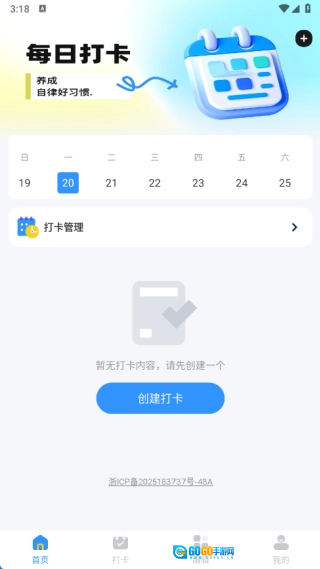 在首页能够进行打卡管理,并且可以随时使用创建打卡的功能。