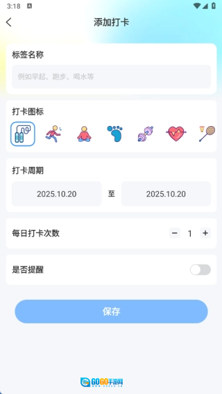 在添加打卡的页面里,依次输入标签名称、选择打卡图标、设置打卡周期和每日打卡次数,开启提醒功能后,点击保存就完成了。