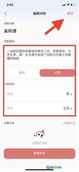 在这里,你可以着手添加故事里的主要角色与物体,像名称、性别、关系之类的信息都能填写;完成添加后点击保存按钮即可;要是希望某个角色在故事里退场,还能对其状态进行修改。