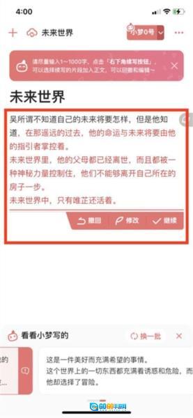 最后,回到写作页面,让小梦进行续写,这样就能借助世界设定,让小梦续写你想要的文章了。