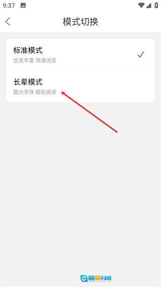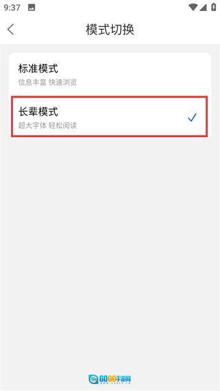 2、进入【模式切换】页面后,可选择【标准模式】(信息丰富,便于快速浏览)或【长辈模式】(字体超大,方便轻松阅读),目前默认设置为【标准模式】。