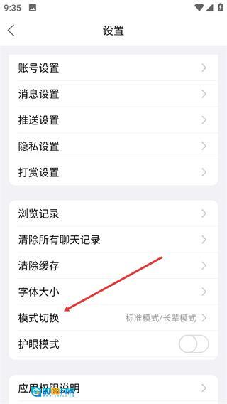 在【设置】页面中,用户能够进行【账号设置】-【消息设置】等功能的操作,点击【模式切换】按钮即可进入模式选择界面,同时也可以开启【护眼模式】。
