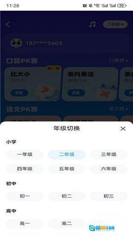 2、点击右上角的按钮,就能切换到不同年级,小朋友可以先和同年级的对手一较高下。