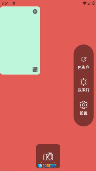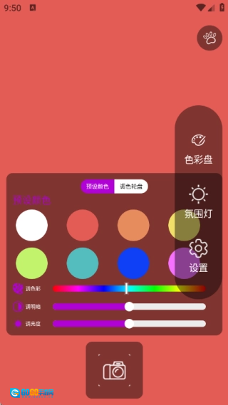 打开软件就能查看色彩盘、氛围灯和各项设置等相关内容,并且可以随时启动拍摄功能。