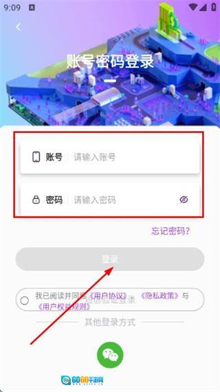 3、进入账号密码登录页面,依次填写账号与密码信息,勾选相关协议条款后,点击登录按钮,即可完成账号登录流程。