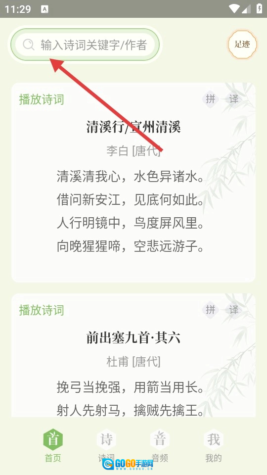 1、进入【首页】后,你可以在搜索框中输入诗词的关键字或者作者姓名来查找相关诗词,也可以直接播放页面上展示的诗词内容。
