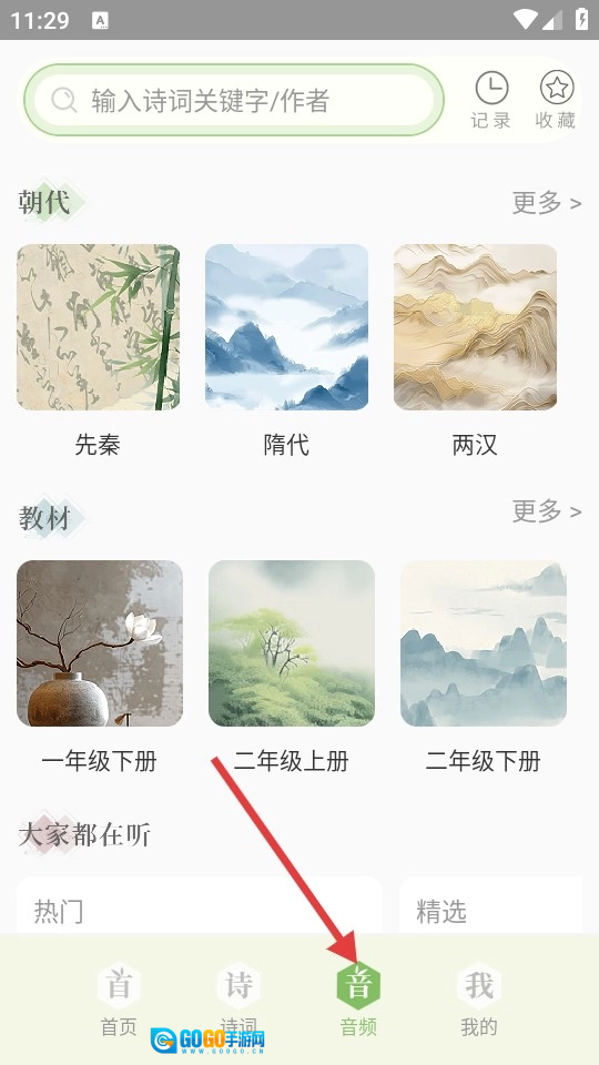 3、切换至【音频】板块,即可挑选不同朝代或与教材相关的诗词音频来收听。