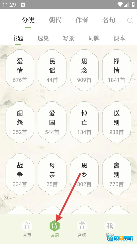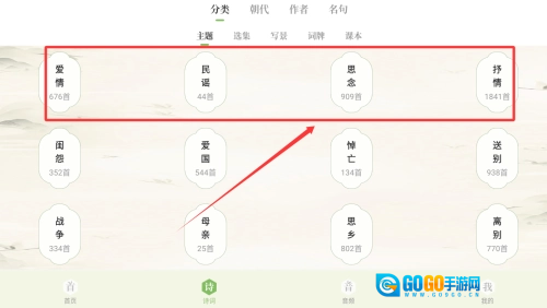 4、依据主题类型对诗歌展开精细化分类,涵盖送别、爱情、战争、思乡、爱国等十多个类别,助力用户有针对性地挑选和学习相关内容。
