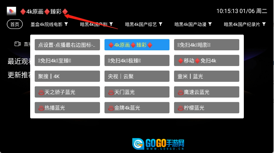 2、来到首页以后点击箭头指示位置选择播放源