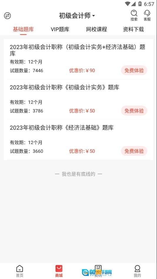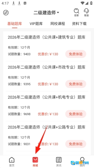 2、在底部“商城”栏目中,你可以购买专业相关的各种题库,可以先免费体验之后再购买;