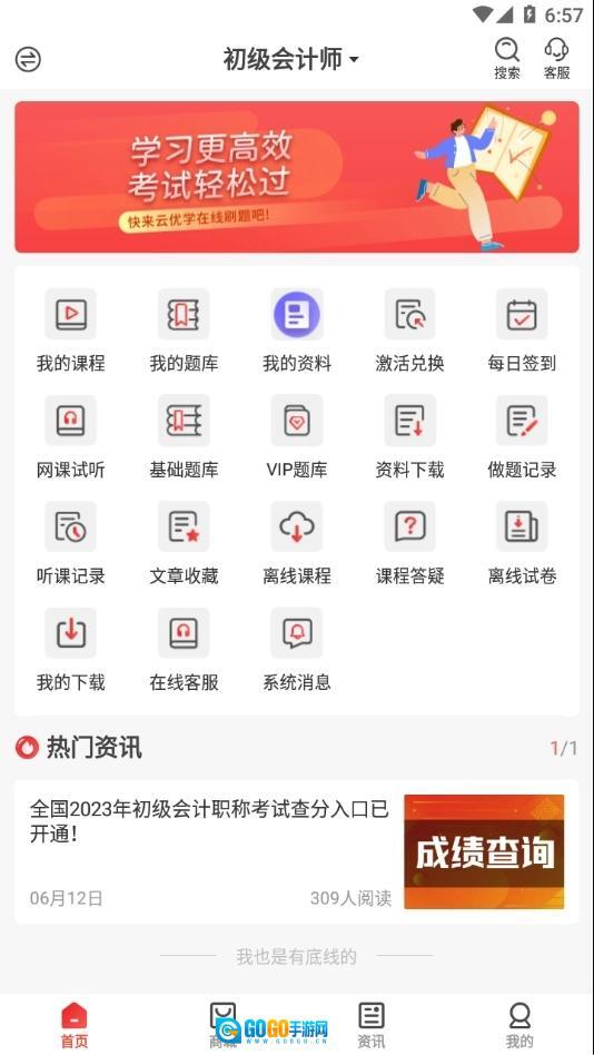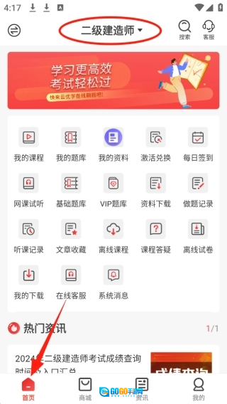 进入首页后,页面最上方设有考试类别调整入口,可随时切换考试类型;首页内整合了你的各类课程与题库资源。