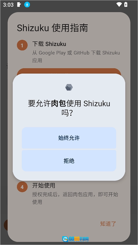 在 Shizuku 中为肉包授予必要权限;