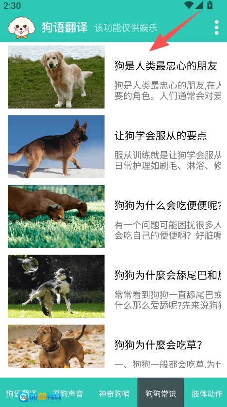 在狗狗常识板块,可以浏览诸如“狗是人类最忠心的朋友”之类的内容。