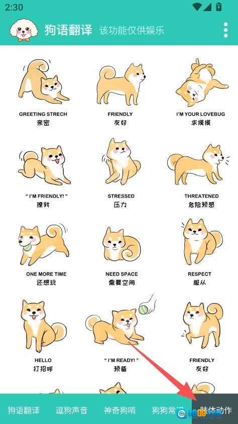点击“肢体动作”,了解狗狗不同姿态的含义。
