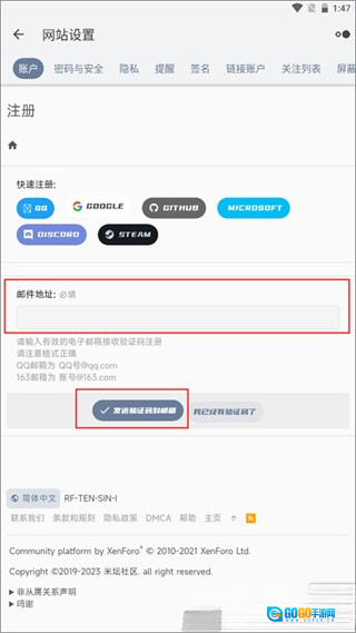3.进入注册页面后,填写邮件地址,随后点击页面下方的“发送验证码至邮箱”按钮。