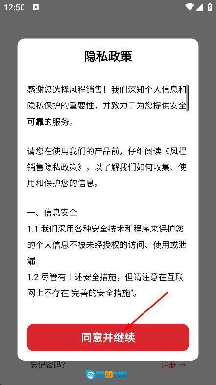 1、在隐私政策弹窗中,点击同意并继续,进入。