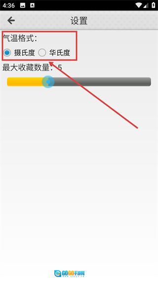 3、进入设置页面后,找到【气温格式】这一选项,然后选择【华氏度】。
