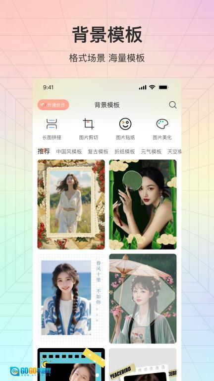 2、视频编辑的旁边就是图片编辑功能,在这里能够对图片进行拼接和裁剪操作。选好图片框架后,还可以添加滤镜与背景,素材资源十分丰富,完全可以放心挑选!