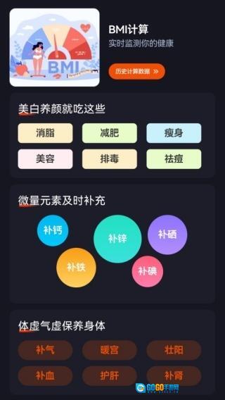 2、点击“健康”选项后,不仅能够进行BMI计算,还能找到美白养颜类的美食推荐。