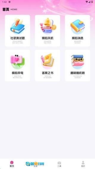 1、完成安装并进入首页后,你可以使用社恐测试题、模拟来电、答案之书等功能。