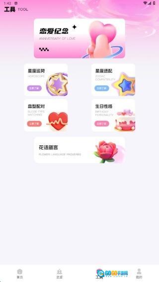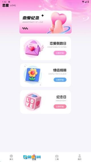 2、恋爱页面提供倒数日、纪念日、情侣相册等功能支持。