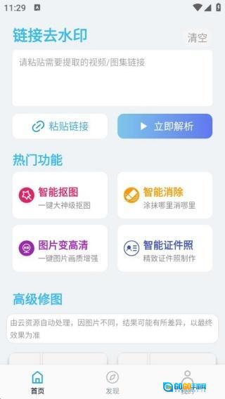 3、具备链接去水印功能,支持智能抠图、智能消除、一键提升图片画质,还能开展高级老照片修复操作。