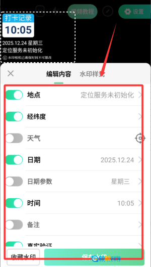 3、接着点击编辑内容,选择地点、时间和日期,之后再点击右下角的保存水印按钮。