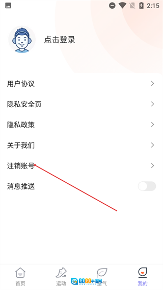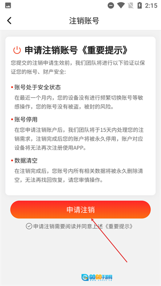 2、进入个人中心界面后,点击【注销账号】选项,即可跳转至注销账号的重要提示页面。