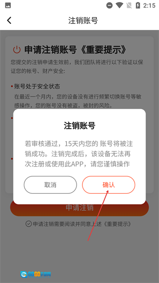 4、在账号注销确认弹窗里,点击【确认】按钮提交注销申请(申请通过后会在15天内完成账号注销)。