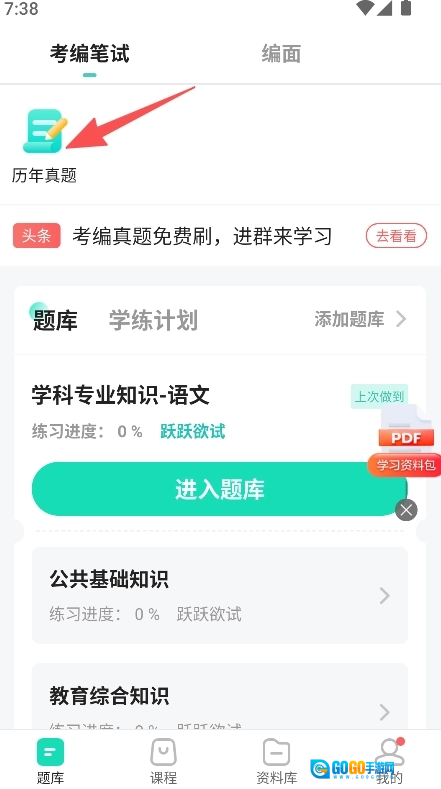 1、打开软件进入考编笔试页面,点击历年真题进入题库板块。