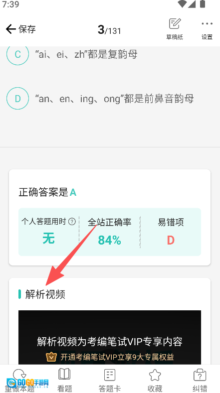 3、完成题目作答后,系统会呈现正确答案及全站正确率,并提供配套的解析视频,以此为备考过程提供答题反馈和知识解析方面的支持。