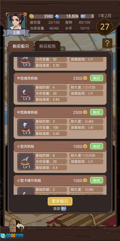 这时候差不多能攒到8500金币啦!不过这点金币根本不够用,得想办法赚更多才行!先买一艘新船吧,建议选那艘容量100的,只要花2500金币就够了。防御方面不用太纠结,前期海盗没那么多,就算碰到了避开走就好啦。