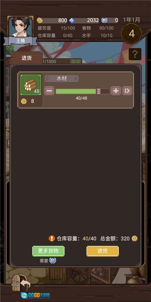 把带来的小麦粉卖掉,然后全部换成木头——我运气不错,换到的是良品木头,通常情况下都是普通木头,边框是绿色的。之后补充食物(这点之后就不再重复了,记住及时补充就行),要是船有损坏,就去船坞修理一下。